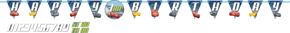 - Cars 3 Jumbo Add-An-Age Letter Birthday Banner feature pennant flags that spell out “Happy Birthday” with Lightning McQueen, Cruz Ramirez, or Jackson Storm on each flag