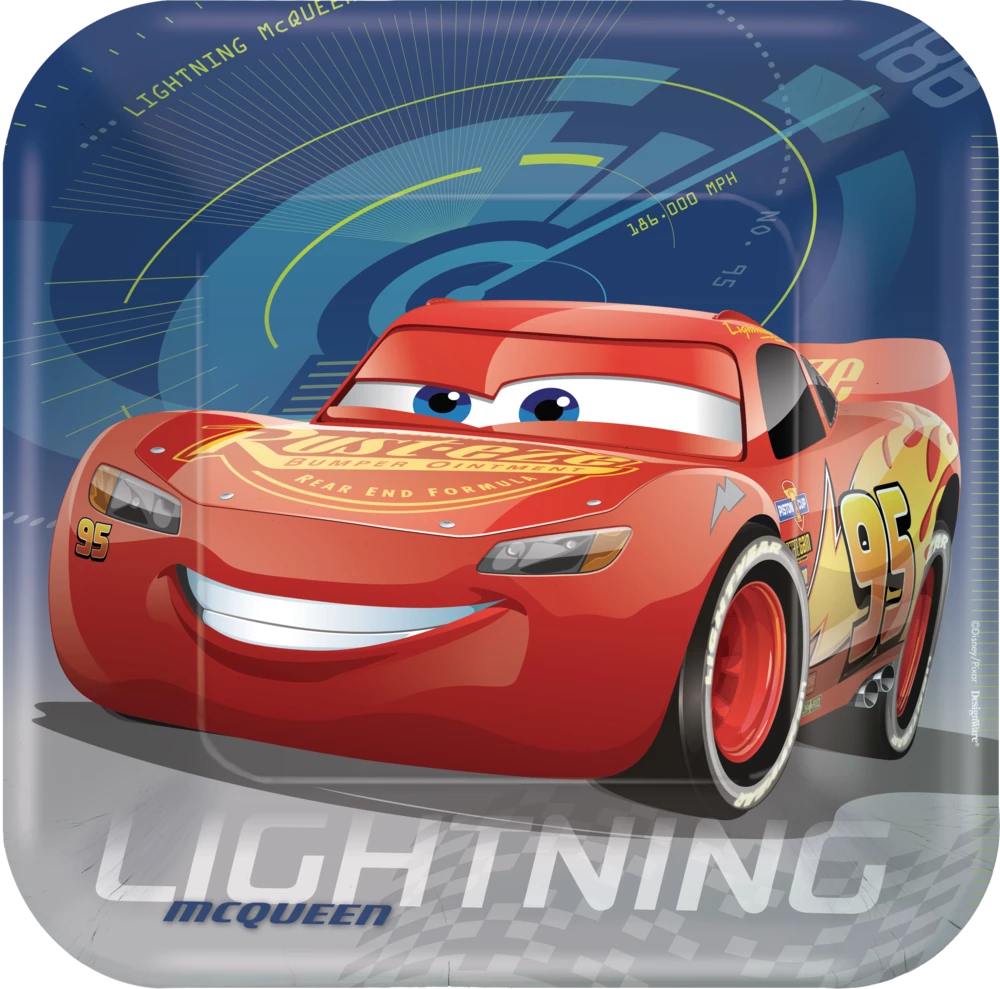 - Cars 3 Lunch Plates feature an image of Lightning McQueen against a navy blue background