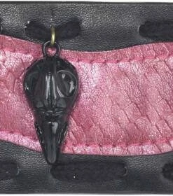 - Jewellery set includes a black and pink cuff as well as a necklace featuring a split heart pendant framed by two bird charms