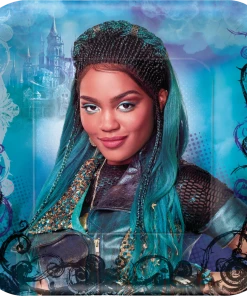 - Feature three different plate designs of Uma, Mal and Evie with a faint image of Bargain Castle in the background