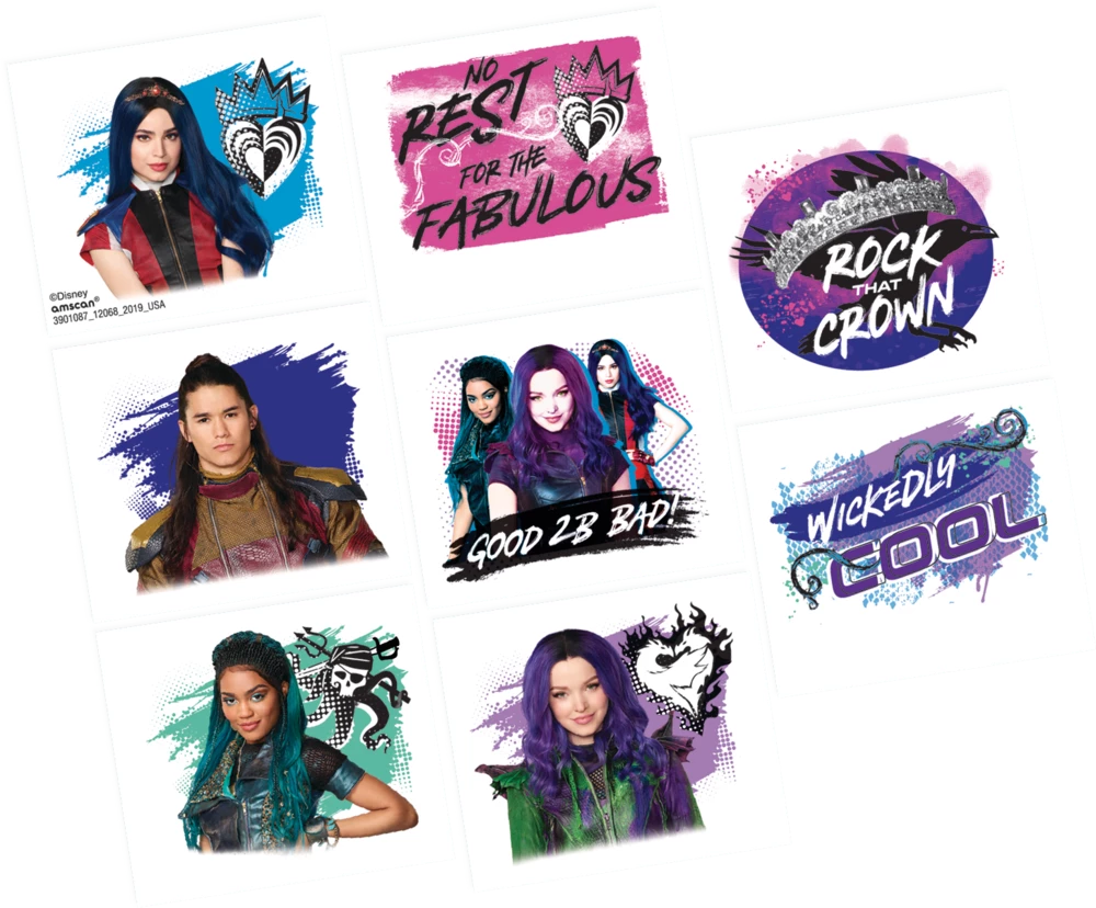 - Temporary tattoos feature Evie, Jay, Mal, and Uma plus fun headlines such as “Rock That Crown” and “Wicked Cool”