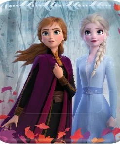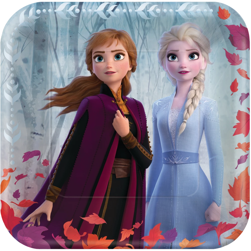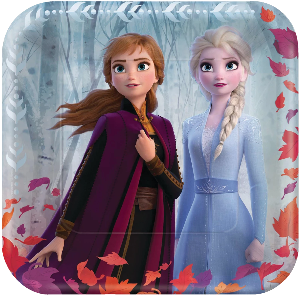 - Square paper plates feature Anna and Elsa on a blue forest background