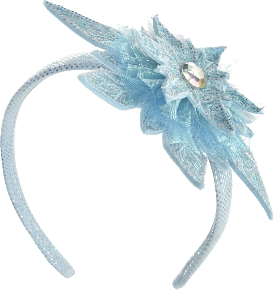 - light blue headband features a layered light-blue fabric snowflake with an attached plastic gemstone