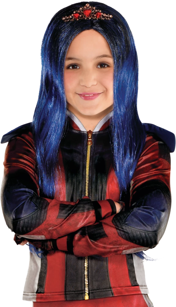 - The dark blue wig features a tiara at the crown with an attached red heart gem designed to look just like Evie